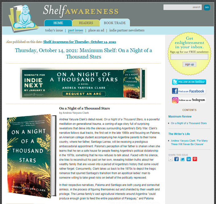 Maximum Shelf Awareness' review of ON A NIGHT OF A THOUSAND STARS and an interview with the author.